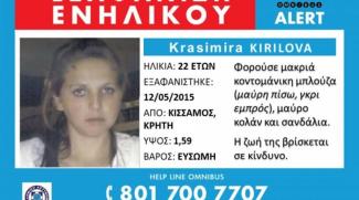 Σχεδόν μία εβδομάδα συμπληρώνεται από την εξαφάνιση της 22χρονης Krasimira Kirilova τα ίχνη της οποίας χάθηκαν την περασμένη Τρίτη στην Κίσσαμο της Κρήτης.