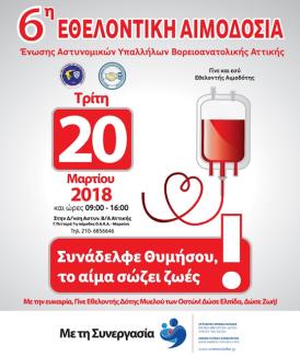 Την Τρίτη 20 Μαρτίου 2018 και από ώρες 09:00 έως 16:00 στην έδρα της Δ/νσης Αστυνομίας Β/Α Αττικής (Γ. Πιτταρά 1η πάροδος Ο.Α.Κ.Α., Μαρούσι) θα πραγματοποιηθεί εθελοντική ομαδική αιμοδοσία με σκοπό την ενίσχυση της τράπεζας αίματος της Ένωσής μας.