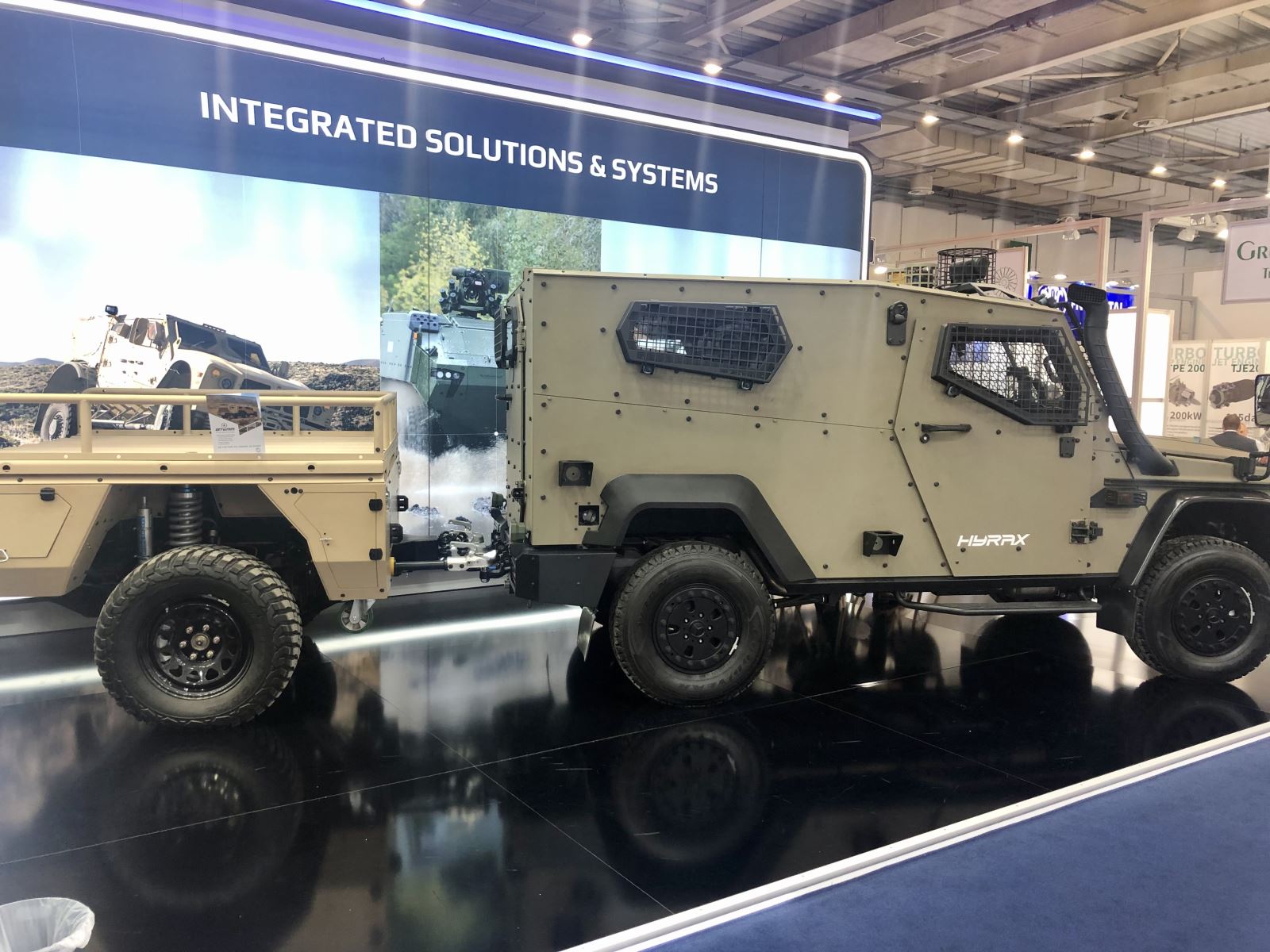 Η δεύτερη εισήγηση έρχεται από τη νέα ΕΛΒΟ, που, μετά την είσοδο των Ισραηλινών, ευελπιστεί να αναγεννηθεί και να αποτελέσει τον εθνικό φορέα κατασκευής του νέου τζιπ. Όπως διευκρινίζουν οι υπεύθυνοι της εταιρείας στη Realnews, το αντικείμενό της δεν αφορά την παραγωγή συγκεκριμένου οχήματος αλλά τη συναρμολόγηση, επισκευή, διαμόρφωση και αναβάθμιση όλων των τύπων οχημάτων ως υπεργολάβος μεταφέροντας τεχνολογία αιχμής με καταγεγραμμένη εμπειρία στα πεδία μαχών. Στο περίπτερό της ξεχώρισαν δύο θηριώδη οχήματα, που έρχονται ως προτάσεις για τις Ένοπλες Δυνάμεις. Το ένα είναι το ελαφρά θωρακισμένο, ευκίνητο, 4x4, Hyrax, βάρους 4,8 τόνων, που εγκαινιάζει μια νέα αντίληψη για τα μικρά οχήματα μεταφοράς. Μεταφέρει μέχρι και 8 άτομα, ενώ ανταποκρίνεται σε επιφάνειες με κλίση έως και 80% και πλευρική κλίση έως 54%. Η στρατιωτική του έκδοση επιδέχεται ηλεκτρονικό, μέσα από την καμπίνα, χειρισμό των όπλων του, είτε πρόκειται για το Mini Samson ή για το Light RCWS EB5. Το Hyrax βασίζεται στο γνωστό σασί του Mercedes G-Wagon, δηλαδή των υπαρχόντων τζιπ του Στρατού.