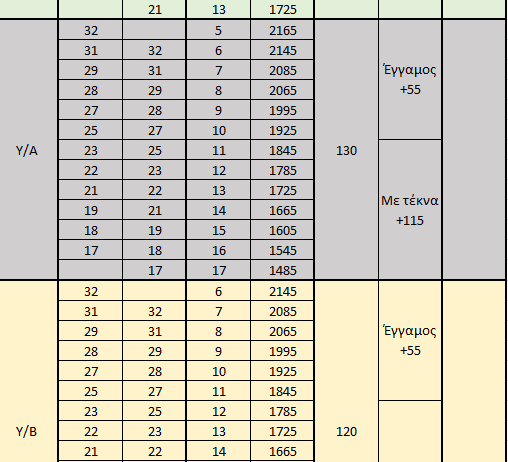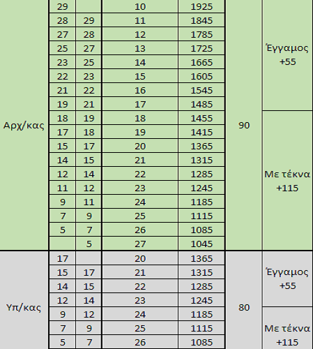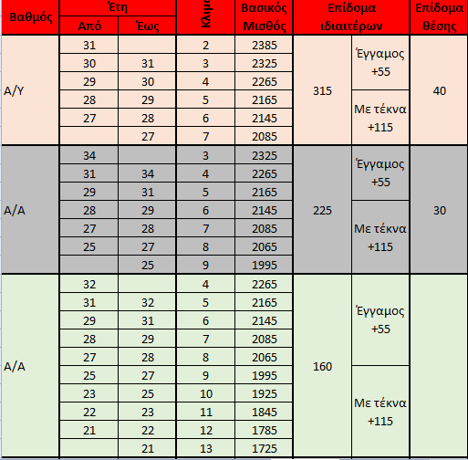 Οι παρακάτω πίνακες αφορούν τους αξιωματικούς του ν.δ. 649/1970, τους υπαξιωματικούς (Αρχ/κες,Υπ/κες,Αστ/κες) , Ανθυπαστυνόμους και αξιωματικούς που προέρχονται από παραγωγικές ή μη σχολές της ΕΛ.ΑΣ.