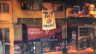 Στο κτήριο το οποίο ήταν σε κατάληψη και έκανε επιχείρηση η ΕΛ.ΑΣ. κρέμασε πανό ομάδα αντιεξουσιαστων στο πλαίσιο των δράσεων που γίνονται στην περιοχή των Εξαρχείων από ομάδες ατόμων ενάντια στις επιχειρήσεις της αστυνομίας.