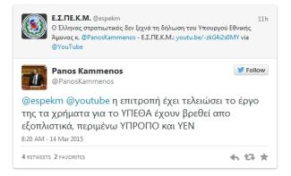 Άμεση ήταν η απάντηση του Υπουργού Εθνικής Άμυνας κ. Πάνου Καμμένου στο “Tweet” της Ε.Σ.ΠΕ.Κ.Μακεδονίας σχετικά με τα αναδρομικά των Στρατιωτικών από την απόφαση του ΣτΕ.