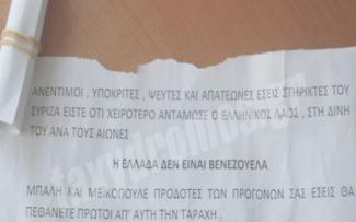 Ξετυλίγοντας το χαρτί, διάβαζε κανείς το μήνυμα: «Ανέντιμοι, υποκριτές, ψεύτες και απατεώνες εσείς υποστηρικτές του ΣΥΡΙΖΑ είστε ό,τι χειρότερο αντάμωσε ο ελληνικός λαός, στη δίνη ανά τους αιώνες. Η Ελλάδα δεν είναι Βενεζουέλα. Μπαλή και Μεϊκόπουλε προδότες των προγόνων σας εσείς θα πεθάνετε πρώτοι απ’ αυτή την ταραχή».