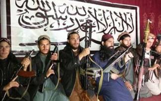 Οι ένοπλοι ποζάρουν μπροστά από μια σημαία που γράφει: «Δεν υπάρχει άλλος θεός παρά μόνο ο Αλλάχ και ο Μωάμεθ είναι ο Προφήτης του».