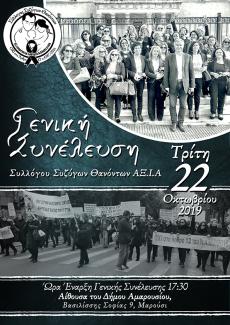 Ο Σύλλογος Συζύγων Θανόντων ΑΞ.Ι.Α θα πραγματοποιήσει την Τρίτη 22 Οκτωβρίου 2019 την ετήσια Γενική Συνέλευση σε αίθουσα του Δήμου Αμαρουσίου (Βασιλίσσης Σοφίας 9, Μαρούσι, Αττική). Ώρα έναρξης 18:00.