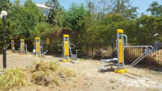 Ο εξοπλισμός των υπαίθριων γυμναστηρίων περιλαμβάνει όργανο έκτασης ποδιών, stepper, πιέσεων ώμων και έλξεως ώμων, ποδηλάτου, ελλειπτικής κίνησης ποδιών, παράλληλων μπάρων, πάγκου κοιλιακών, όργανο εκτάσεων και βάδισης αέρος κ.λ.π. Κάθε όργανο φέρει πληροφοριακή πινακίδα με αναλυτικές οδηγίες χρήσεως και ενημέρωσης για τους ασκούμενους.