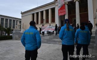 Η ομάδα των φοιτητών μπροστά από το κτίριο στα προπύλαια έχει βάλει δύο πανό τα οποία δηλώνουν την αντίθεση μερίδας της φοιτητικής κοινότητας στην παρουσία της αστυνομίας στα πανεπιστημιακά ιδρύματα και το νέο νομοσχέδιο του υπουργείου Παιδείας.