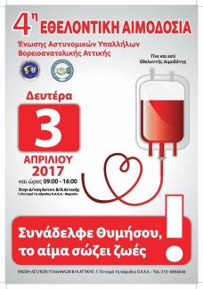 Την Δευτερα 3/04/2017 και κατά τις ώρες 09:00 έως 16:00 στην έδρα της Δ/νσης Αστυνομίας Β/Α Αττικής (Γ. Πιτταρά 1η πάροδος Ο.Α.Κ.Α., Μαρούσι) θα πραγματοποιηθεί εθελοντική ομαδική αιμοδοσία με σκοπό την ενίσχυση της τράπεζας αίματος της Ένωσης Aστυνομικών Υπαλλήλων Βορειοανατολικής Αττικής.