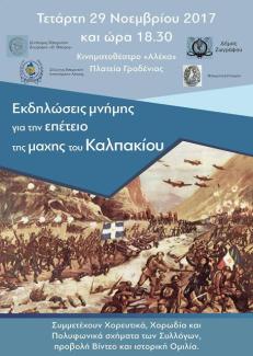 Ο Σύλλογος Ηπειρωτών Αστυνομικών Αττικής, ο Σύνδεσμος Ηπειρωτών Ζωγράφου «Η ΉΠΕΙΡΟΣ», και η Ηπειρωτική Εταιρεία σε συνεργασία με τον Δήμο Ζωγράφου, σας προσκαλούν να μας τιμήσετε με την παρουσία την Τετάρτη 29 Νοεμβρίου 2017 στις 6:30μ.μ. στο Κινηματοθέατρο Αλέκα (3ης Ορεινής Ταξιαρχίας 13, Ζωγράφου), στην εκδήλωση μνήμης που διοργανώνουν για την Μάχη του Καλπακίου.