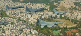 Σχηματισμός δύο αμερικανικών και δύο ελληνικών μαχητικών αεροσκαφών πέταξαν σε χαμηλό ύψος πάνω από την Αθήνα νωρίς το μεσημέρι, στο πλαίσιο της άσκησης «Ηνίοχος».