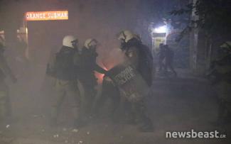Επίσης στην Σπύρου Τρικούπη ομάδα κουκουλοφόρων πέταξε βόμβες μολότοφ και άλλα αντικείμενα σε διμοιρίες των ΜΑΤ.