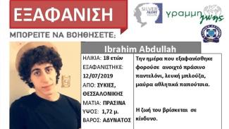 Την εξαφάνιση ενός νεαρού από τη Θεσσαλονίκη γνωστοποίησε η Γραμμή Ζωής Silver Alert. Πρόκειται για τον 18χρονο Ibrahim Abdullah, τα ίχνη του οποίου χάθηκαν από την περιοχή των Συκεών στις 12 Ιουλίου του 2019.
