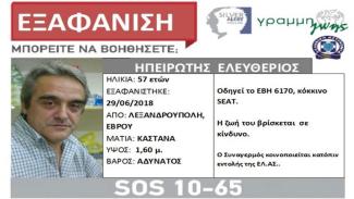 Είναι ο Ελευθέριος Ηπειρώτης 57 χρόνων, που αγνοείται από το πρωί της Παρασκευής 29 Ιουνίου από την Αλεξανδρούπολη. Οδηγεί ένα κόκκινο Seat με αριθμό κυκλοφορίας ΕΒΗ 6170.