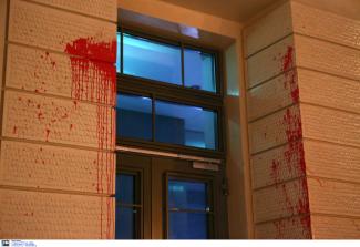 Οι δράστες πέταξαν κόκκινες μπογιές στο κτήριο και διέφυγαν στα γύρω στενά.