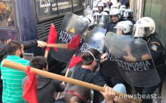 Ένταση σημειώθηκε στη φοιτητική πορεία το μεσημέρι της Πέμπτης, όταν διαδηλωτές επιτέθηκαν με ξύλα στους αστυνομικούς των ΜΑΤ.