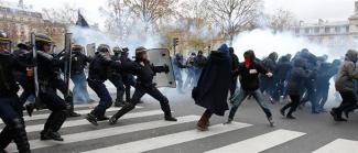 Περίπου 200 διαδηλωτές, ορισμένοι με καλυμμένα τα πρόσωπα, συγκρούστηκαν με την αστυνομία σε έναν δρόμο που οδηγεί στην πλατεία, η οποία έχει γίνει σημείο συγκέντρωσης για τους Παριζιάνους μετά τις επιθέσεις της 13ης Νοεμβρίου στην πρωτεύουσα κατά τις οποίες σκοτώθηκαν 130 άνθρωποι.