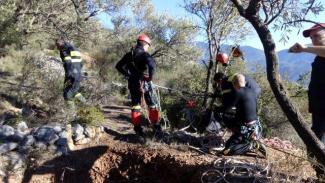 Στην επιχείρηση συμμετέχουν τέσσερις ειδικά εκπαιδευμένοι άνδρες της 7ης ΕΜΑΚ με εμπειρία στις καταρριχήσεις – αναρριχήσεις για την ασφαλή ανάσυρση του σκύλου.