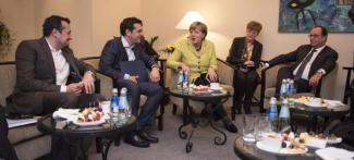 Στη συνάντηση συμμετείχαν εκ μέρους της ελληνικής πλευράς και ο υπουργός Επικρατείας Νίκος Παππάς και ο αναπληρωτής υπουργός Διεθνών Οικονομικών Σχέσεων Ευκλείδης Τσακαλώτος. Η κ. Μέρκελ και ο κ. Ολάντ έφτασαν διαδοχικά, με μερικά λεπτά διαφορά, στο ξενοδοχείο όπου λαμβάνει χώρα η συνάντηση, ενώ τελευταίος έφτασε ο Ελληνας Πρωθυπουργός.