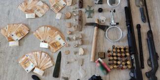 • αντικείμενα που εμπίπτουν στην Νομοθεσία περί Αρχαιοτήτων (μεταλλικός σταυρός, μεταλλική λάμα, μεταλλική κεφαλή σφυριού, μολυβένια αντικείμενα),