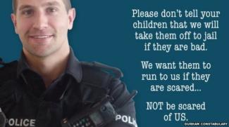 Ο χαμογελαστός νεαρός αστυνομικός του Ντάρχαμ λέει στην επίμαχη αφίσα: «Σας παρακαλώ μη λέτε στα παιδιά σας, ότι θα τα βάλουμε φυλακή, αν κάνουν κάτι κακό». «Θέλουμε να καταφεύγουν σε εμάς όταν φοβούνται και όχι να μας φοβούνται».