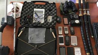 Στο πλαίσιο των ερευνών που πραγματοποιήθηκαν με τη συνδρομή αστυνομικού σκύλου, σε σπίτια, οχήματα, υπαίθριους χώρους αλλά και στην κατοχή των μελών της οργάνωσης βρέθηκαν και κατασχέθηκαν ποσότητα κρυμμένης κοκαΐνης σε φιξάκια, βάρους 26,7 γραμμαρίων και ηλεκτρονική ζυγαριά με υπολείμματα κοκαΐνης, τέσσερις συσκευές ανίχνευσης μετάλλων, μεταλλικές βέργες ραβδοσκοπίας και ένας φορητός ανιχνευτής, 110 μεταλλικά νομίσματα και τρεις λίθοι, τριάντα χαρτονομίσματα παλαιάς εκτύπωσης, μία συσκευασία με πυρίτιδα, και ένας αυτοσχέδιος πυροκροτητής, μία καραμπίνα, τρία ξίφη και ένα σπρέι πιπεριού, ηλεκτρονικές γεννήτριες, φορτιστές μπαταρίας και ρεύματος, κάμερες, πυξίδα, ασύρματοι, tablet, πλήθος κινητών τηλεφώνων, χειρόγραφες σημειώσεις, ημερολόγια, φωτογραφίες, χάρτες, το ποσό των 930 ευρώ και δύο Ι.Χ..