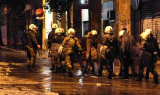 Οι διαδηλωτές φωνάζουν συνθήματα κατά των αστυνομικών επιχειρήσεων στην ΑΣΟΕΕ, στα Εξάρχεια και τις εκκενώσεις καταλήψεων.