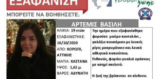 Το μυστήριο της εξαφάνισης της 19χρονης από το Κορωπί συνεχίζεται. Η 19χρονη Άρτεμις παραμένει αγνοούμενη από τα μέσα του περασμένου μήνα, όταν κάμερες ασφαλείας καταστημάτων στο Κορωπί την κατέγραψαν να περπατάει στην οδό Αττικής.