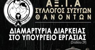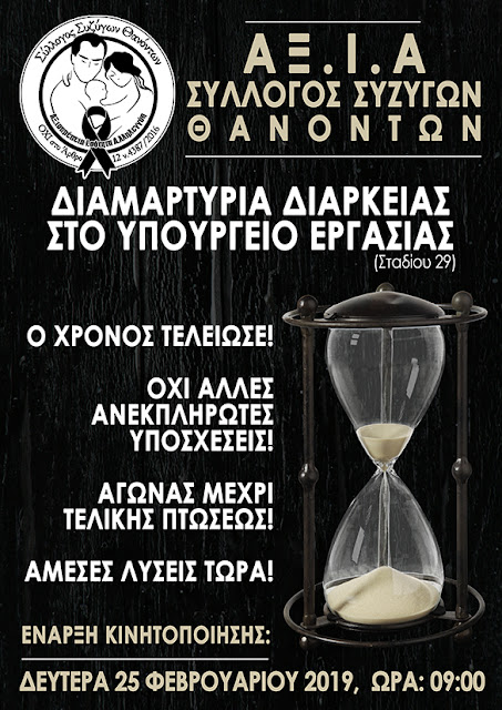 Το Διοικητικό Συμβούλιο του Συλλόγου Συζύγων Θανόντων ΑΞ.Ι.Α μετά τη συνεχιζόμενη αναβλητικότητα της κυβέρνησης για την κατάργηση του επαίσχυντων διατάξεων του άρθρου 12 του ν.4387/2016, αποφάσισε να ξεκινήσει από τη Δευτέρα 25/2 διαμαρτυρία διαρκείας έξω από το Υπουργείο Εργασίας και όχι μόνον, μέχρι η υπόψη ρύθμιση να κατατεθεί στη Βουλή.