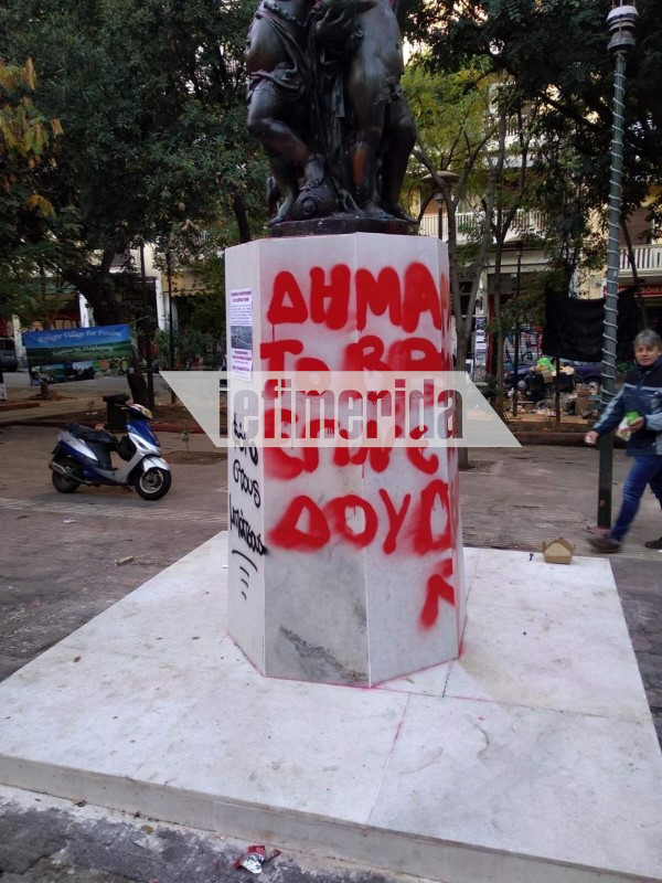 Φωτογραφίες του iefimerida.gr από το άγαλμα στην πλατεία Εξαρχείων: