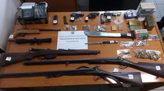 Όπως διαπίστωσαν οι άνδρες της Ασφαλείας Καλαμάτας που έκαναν έρευνα στην κατοικία του μετά από πληροφορίες, είχε στην κατοχή του ένα ημιαυτόματο πολεμικό όπλο, ένα πιστόλι, ένα περίστροφο, ένα πιστόλι κρότου, τρεις γεμιστήρες, τρία κυνηγετικά όπλα από τα οποία το ένα αυτοσχέδιο, 895 φυσίγγια διαφόρων τύπων και διαμετρημάτων, μια μεταλλική σπάθα με λάμα μήκους 0,36 εκατοστών, ένα αναδιπλούμενο στιλέτο, μια διόπτρα τυφεκίου και 33 κροτίδες. Ο 56χρονος παραπέμφθηκε στον εισαγγελέα Πλημμελειοδικών Καλαμάτας με κατηγορίες για παράβαση των νομοθεσιών για τα όπλα και τα βεγγαλικά, ενώ οι αστυνομικοί συνεχίζουν την προανάκριση για τυχόν εμπλοκή του σε άλλες παρανομίες.