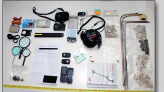 Η αστυνομία, πριν από τέσσερα χρόνια περίπου, είχε κάποιες πληροφορίες ότι ο κατηγορούμενος προβαίνει σε αγοραπωλησίες αρχαίων νομισμάτων και αντικειμένων. Κάνει έρευνα στο σπίτι του στη Λάρισα και βρίσκει ένα αρχαίο χρυσό νόμισμα, δύο ραβδοσκόπους και μια κενή συσκευασία από ανιχνευτή μετάλλων όπως και ένα ζευγάρι από τα αντίστοιχα ακουστικά. Στη συνέχεια έγινε έλεγχος και στο αυτοκίνητό του, όπου και βρέθηκε ο κύριος όγκος των αντικειμένων (203 ασημένια νομίσματα της αρχαίας Ρόδου, 39 αργυρά νομίσματα της αρχαίας Εφέσου, 47 χάλκινα νομίσματα της βυζαντινής περιόδου, δύο ακόμα νομίσματα και ένα μετάλλινο προσωπείο σάτυρου) ενώ ο έλεγχος ολοκληρώθηκε σε ακόμα ένα σπίτι και γραφείο.