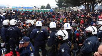 Δυνάμεις των ΜΑΤ, απομακρύνουν τους μετανάστες, ενώ νωρίτερα είχαν κάνει το ίδιο με τους δημοσιογράφους και τους φωτορεπόρτερ που βρίσκονταν στην περιοχή.