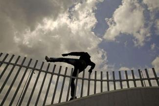 4 Μαΐου 2015. Ενας αξιωματικός φωνάζει σε Αφγανούς μετανάστες που πήδηξαν πάνω από φράχτη στον τερματικό σταθμό του Λιμανιού της Πάτρας. Για πολλούς μετανάστες το ταξίδι για μια καλύτερη ζωή στην Ευρώπη δεν τελειώνει στην Ελλάδα. Περίπου 100 Αφγανοί, Ιρανοί και Σουδανοί μετανάστες ζουν σε δύο εγκαταλειμμένες βιοτεχνίες και εργοστάσια απέναντι ακριβώς από το λιμάνι. Τρέφονται με αποφάγια και δεν έχουν ηλεκτρικό