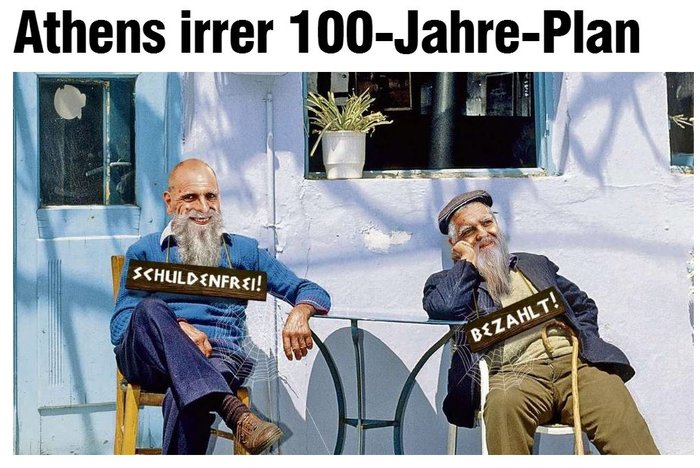 Με αυτή την εικόνα, η εφημερίδα θέλει να σχολιάσει πώς η Ελλάδα αντιμετωπίζει τους δανειστές και ποιο είναι το «πνεύμα» της Ελληνικής πρότασης για το χρέος: Το περιγράφει με την εικόνα δύο ηλικιωμένων Ελλήνων, δύο συνταξιούχων, που σε φόντο Ελληνικού καφενείου, χαχανίζουν ανάλαφρα αραχνιάζοντας στις καρέκλες τους. Από το λαιμό τους κρεμασμένες δύο ταμπέλες που γράφουν για ελευθερία από το χρέος.
