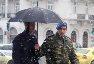 Είναι οι ήρωες Εύζωνες, που υπέμειναν το κρύο και το πυκνό χιόνι που έπεσε το απόγευμα της Τρίτης στο κέντρο της Αθήνας.