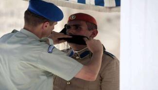Η ύψιστη τιμή του να ανήκεις στην Προεδρική Φρουρά συνοδεύεται και από πολλές δύσκολες στιγμές. Γι΄αυτο και ένας λοχίας έχει αναλάβει να τους σκουπίζει τον ιδρώτα από το μέτωπο, σήμερα, αφού η ζέστη στο Σύνταγμα, ήταν αποπνικτική.