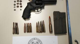 Οι αστυνομικοί βρήκαν ακόμη ένα πιστόλι, ένα αεροβόλο περίστροφο, μία συσκευασία που περιείχε 9,2 γραμμάρια πυρίτιδας, ένα γεμιστήρα με εννέα φυσίγγια, τέσσερα αβολίδωτα φυσίγγια, τέσσερις κάλυκες, τρεις βολίδες και μία μεταλλική ξιφολόγχη.