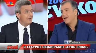 Ο παρουσιαστής απευθυνόμενος στον πρώην συνάδελφό του και νυν πρόεδρο του Ποταμιού, του είπε ότι το κόμμα του ψήφισε το τρίτο μνημόνιο και η απάντηση του Θεοδωράκη τον έκανε έξαλλο κι αποτέλεσε αιτία για να ξεσπάσει καυγάς.