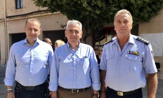 Φωτ. 1 Ο Μάξιμος Χαρακόπουλος με τον Διοικητή της Πυροσβεστικής Υπηρεσίας Ρόδου κ. Ηλία Τσαπούρα και τον πρόεδρο της ΝΟΔΕ Δωδεκανήσου κ. Παύλο Μπακίρη.