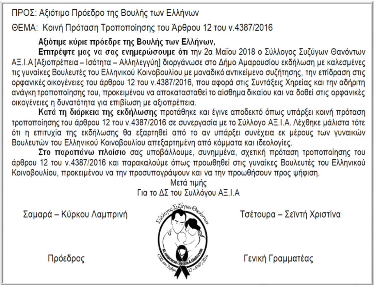 Σε συνέχεια της εκδήλωσης που πραγματοποίησε την 2α Μαΐου 2018 ο Σύλλογος Συζύγων Θανόντων ΑΞ.Ι.Α με γυναίκες βουλευτές του Ελληνικού Κοινοβουλίου [ΕΔΩ] και στο πλαίσιο των αποφάσεων αυτής, κατατέθηκε την 21η Ιουνίου 2018 στον πρόεδρο της Βουλής πρόταση τροποποίησης του άρθρου 12 του ν.4387/2016 ώστε να δοθεί στις γυναίκες βουλευτές του Ελληνικού Κοινοβουλίου για περαιτέρω ενέργειες. Ακολουθούν (1) Επικαλυπτικό έγγραφο προς τον πρόεδρο της Βουλής. (2) Η πρόταση τροποποίησης. (3) Σε δύο στήλες ώστε να φαίνεται με πρώτη ματιά τι ζητά ο Σύλλογος ΑΞ.Ι.Α να τροποποιηθεί. Αριστερή στήλη τι ισχύει. Δεξιά στήλη η πρόταση τροποποίησης.