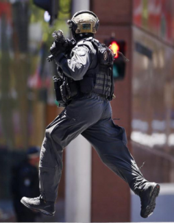 Εκατοντάδες ένοπλοι αστυνομικοί έχουν περικυκλώσει το Lindt Chocolat Cafe, όπου όμηροι κρατούν σ' ένα παράθυρο μια μαύρη σημαία με εν μέρει ορατή μια αραβική επιγραφή. Φαίνεται πως πρόκειται για τη σαχάντα, τη μουσουλμανική ομολογία της πίστης: "Δεν υπάρχει Θεός παρά μόνο ο Αλλάχ και ο Μωάμεθ είναι ο Προφήτης Του".