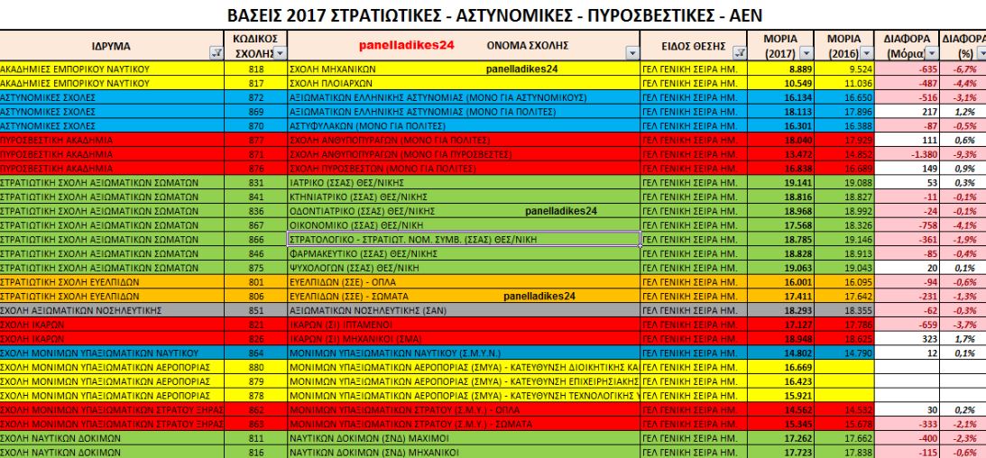 Συγκεκριμένα, ο πίνακας αυτός περιέχει τις ΒΑΣΕΙΣ των 2016 και 2017 για τις συγκεκριμένες σχολές και τη διαφορά των μορίων μεταξύ των δύο ετών. Ο πίνακας επεξεργάστηκε από το panelladikes24.