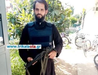 Στη φωτογραφία, βλέπετε τον π. Αριστείδη να φυλάει σκοπιά, κρατώντας το όπλο του και φορώντας αλεξίσφαιρο γιλέκο, στην Αστυνομική Διεύθυνση Τρικάλων…