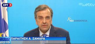 Την παραίτησή του από την ηγεσία της Ν.Δ. ανακοίνωσε ο Αντώνης Σαμαράς, μιλώντας στον απόηχο του δημοψηφίσματος.