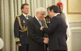 Ευχές από εκπροσώπους της πολιτικής, στρατιωτικής, θρησκευτικής και πνευματικής ηγεσίας της χώρας δέχτηκε σήμερα στο Προεδρικό Μέγαρο ο Προκόπης Παυλόπουλος, αμέσως μετά τη δοξολογία για το νέο έτος που τελέστηκε στον Ιερό Ναό Αγίου Διονυσίου. Μάλιστα, αστειεύτηκε με τον πρωθυπουργό Αλέξη Τσίπρα, λέγοντας του: «και του χρόνου με γραβάτα!», καθώς πιστεύει πως η χώρα θα βγει από το μνημόνιο το 2016. «Πρόεδρε, βάζεις ψηλά τον πήχη», ήταν η απάντηση του Αλέξη Τσίπρα.