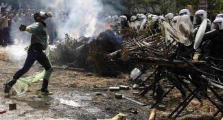 Οι αγρότες έκλεισαν τους δρόμους με τρακτέρ, ενώ ορισμένοι από αυτούς συγκρούστηκαν με την αστυνομία και τους πέταξαν αυγά και γάλα.