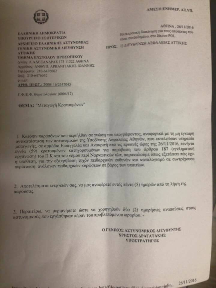 Μετά από παρέμβαση της ένωσης αστυνομικών υπαλλήλων Αθηνών και του αντιπροέδρου Γρηγόρη Χρυσάφη, διατάχθηκε από τον αττικάρχη πειθαρχικος έλεγχος για τους αξιωματικούς που δεν φροντισαν για την αντικατασταση αστυνομικών της υποδιεύθυνσης ασφάλειας Αθηνών που έκαναν μεταγωγή συλληφθέντων στον εισαγγελέα.