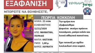 Συναγερμός έχει σημάνει στις αρχές για την εξαφάνιση νεαρής μητέρας. Πρόκειται για τη Γεωργία Κοκκώνη, η οποία αγνοείται από την Πέμπτη 12 Νοεμβρίου από την περιοχή των Μανιάτικων του Πειραιά. Σύμφωνα με το anikolouli.gr η 22χρονη μητέρα κλείδωσε το μωρό της στο σπίτι και άφησε τα κλειδιά στην εξώπορτα, ενώ να σημειωθεί ότι αντιμετωπίζει προβλήματα υγείας.