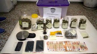 Κάτω από κρεβάτι ο 36χρονος είχε επιμελώς κρυμμένα σε γυάλινα δοχεία και ειδικές συσκευασίες ακατέργαστη ινδική κάνναβη, συνολικού βάρους 3,155 κιλά, μία ζυγαριά ακριβείας, ένα μεταλλικό τρίφτη, πλαστικό δοχείο με υπολείμματα ακατέργαστης ινδικής κάνναβης, 3.000 ευρώ και τρία κινητά τηλέφωνα.