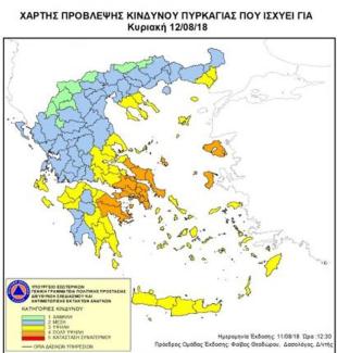 Πολύ υψηλό κίνδυνο πυρκαγιάς «κατηγορία κινδύνου 4» προβλέπει για αύριο Κυριακή 12 Αυγούστου 2018, η Γενική Γραμματεία Πολιτικής Προστασίας για τις περιφέρειες Βορείου Αιγαίου (Λέσβος, Χίος), Στερεάς Ελλάδας (Βοιωτία, Εύβοια, Σκύρος), Αττικής και Πελοποννήσου (Αργολίδα, Κορινθία).